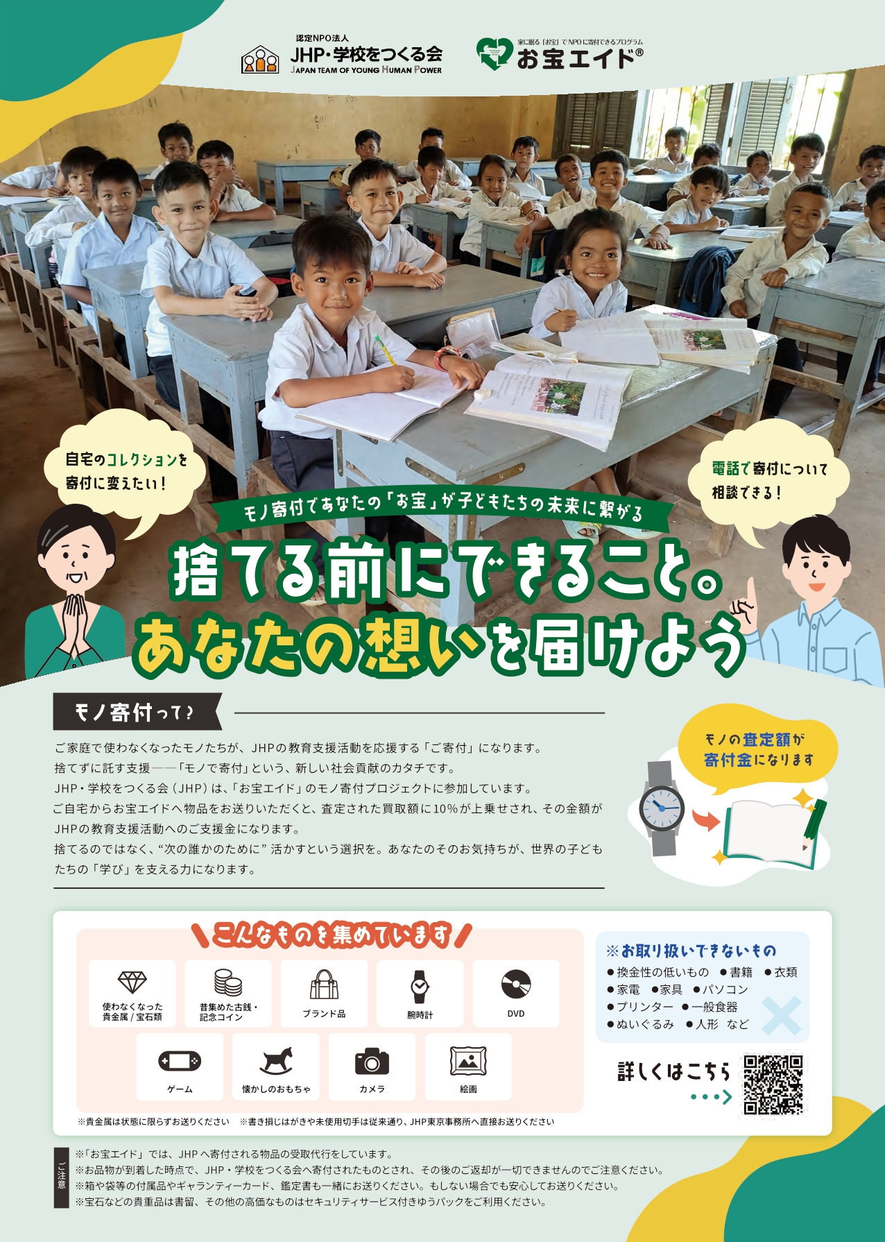 皆様のご自宅等で日頃使われていない品々をお送り頂く際に、寄付先としてJHPを選んでお申込みいただくと、査定金額+お宝エイドから10%上乗せの金額が、JHPへ寄付されます。この寄付金は、税控除の対象となります。