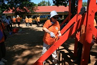 そして、コンターナン小学校に戻り、最後の仕上げのグリス塗りと角カバー取り付けを終了しました。ジュースの差し入れと代表の言葉で、(あぁ、作業が終わるんだなぁ)と、初めて実感しました。皆の思いもここで同じだったのでは・・・と思います。ワゴンに乗り込み、車窓から見えるブランコは、子ども達でいっぱいでした。楽しそうにブランコに乗る子ども達を見て、嬉しさとまた淋しい気持ちで車内を過ごしました。