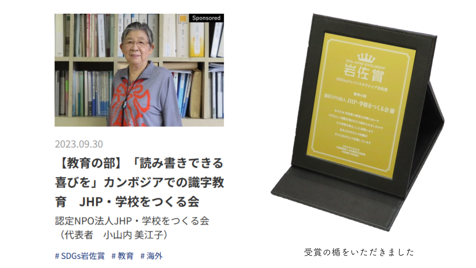 この度、JHPの『成人のための識字教育事業』が、「第3回SDGsジャパンスカラシップ岩佐賞」(SDGs岩佐賞)を【教育の部】で受賞いたしました。