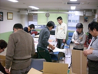 写真@暖房の効いた室内では腕まくりをしながら梱包に励む参加者も